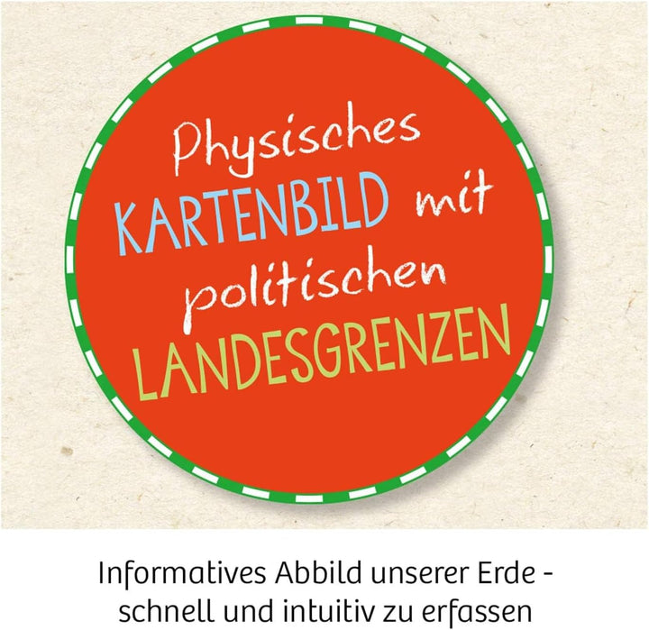 - Kinder erfassen dank der farblichen Abgrenzung auf einen Blick die Ländergrenzen, Gebirgszüge, Wüsten, Wälder und Weltmeere.