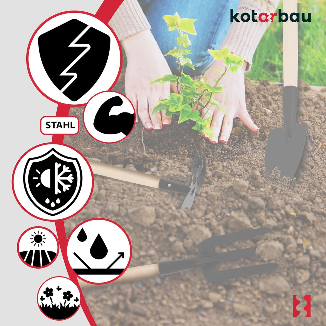 • UNIVERSALITÄT – Der KOTARBAU Gartenwerkzeugsatz hilft Ihnen beim: Einpflanzen, Umtopfen, Umgraben von Pflanzen und Zwiebeln, zum Furchenziehen und Zusammenziehen von lockerem Material und Beseitigung von Unkraut, Belüftung und Bearbeiten des Bodens