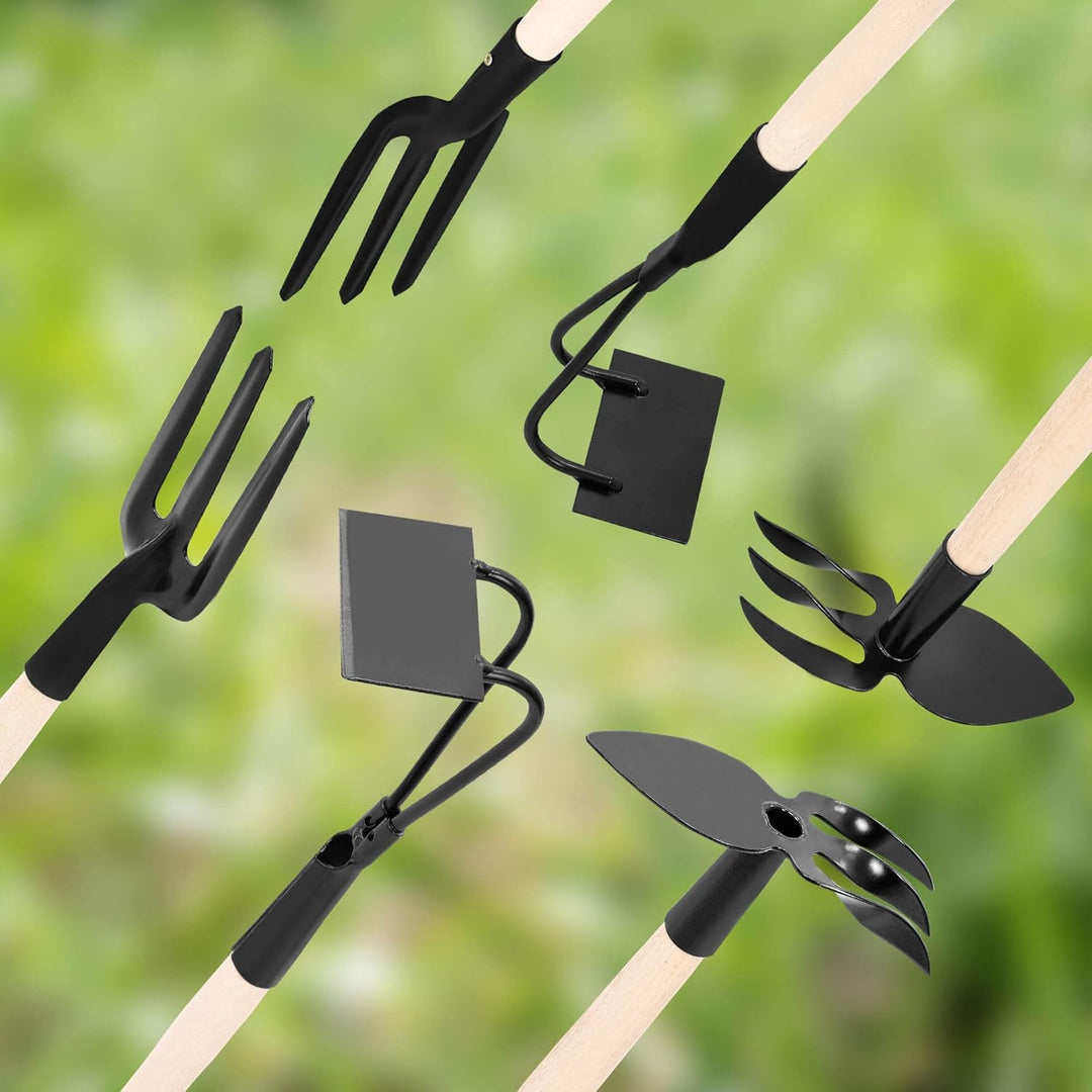 • TECHNISCHE DATEN – Gartenwerkzeugsatz – 6 teiliges Set: Mini Forke, Grubber, Rechen mit Jäter, Spaten, Herzblatthacken mit Rechen und Rechteckhacken, Gewicht des Sets: 1,35 kg, Werkstoff Arbeitskopf: Stahl, Farbe Arbeitskopf: Schwarz, Griff aus Holz