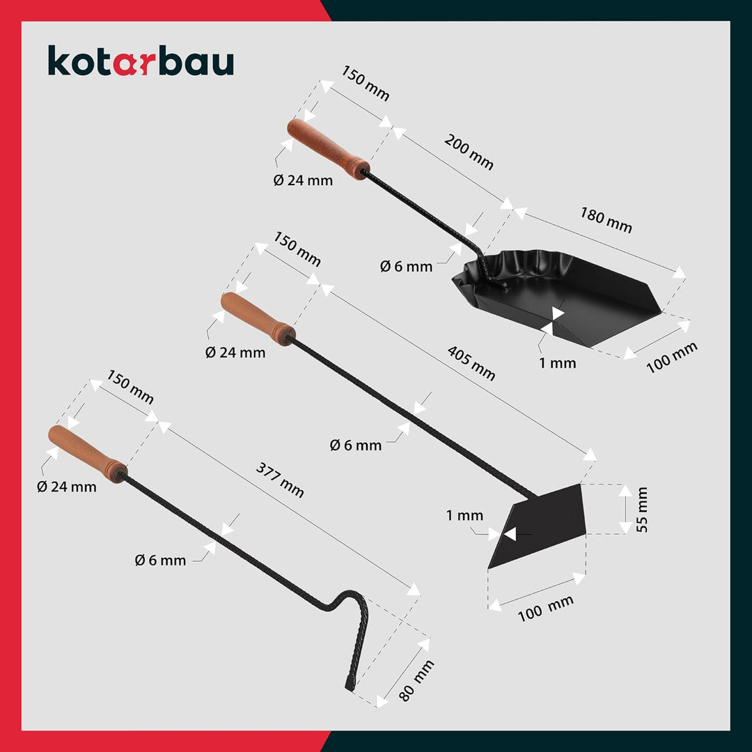 - DIE RICHTIGE VORBEREITUNG DES KAMINS IST MIT DEM KOTARBAU OFENBESTECK SICHER UND EINFACH. Hier finden Sie alle Werkzeuge, die Sie zum Reinigen des Kamins benötigen - einen Schürhaken, einen Besen und eine Kohlenschaufel. Das Set erleichtert die