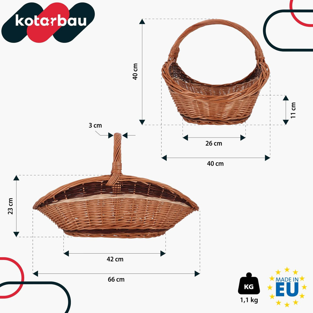 - TECHNISCHE DATEN: Gesamtlänge: 66 cm, Basislänge: 42 cm, Basisbreite: 26 cm, Höhe des Korbes in der Mitte: 11 cm, Gesamthöhe: 40 cm, Höhe ohne Henkel: 23 cm, Gewicht: 1,1 kg, Material: Weide Farbe: Natural / * Alle im Angebot enthaltenen Fotos