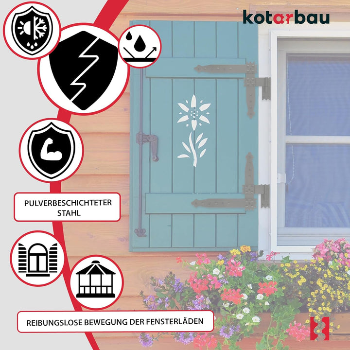 • TOP - QUALITÄT – Die Fensterladen Beschläge von KOTARBAU werden aus hochwertigen Materialien hergestellt. Die Wahl der Rohstoffe gewährleistet ihre lange Lebensdauer. Die Klappladenhalter werden aus Stahl hergestellt. Die ganze Oberfläche ist