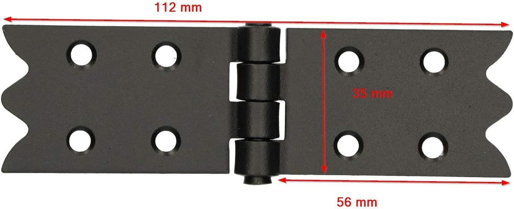 - TECHNISCHE DATEN – Länge des Scharniers: 112 mm – Breite des Produkts: 35 mm – Länge des Flügels: 56 mm – Stärke des Materials: ca. 2 mm – Montagelöcher: ca. 5 mm – Scharnierbolzen: Ø 6,90 mm – Farbe: Schwarz – Material: Stahl –