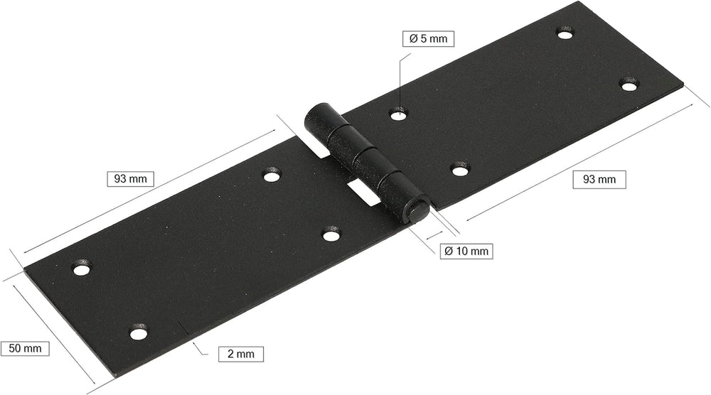 - TECHNISCHE DATEN - Scharnier 200x50 mm – Gesamtlänge: 200 mm, Flügellänge I: 93 mm, Flügellänge II: 93 mm, Breite: 50 mm, Durchmesser Montageöffnung: 5 mm, Achsendurchmesser: 10 mm, Stärke: 2 mm, Material: Stahl, Gewicht: 0,164 kg