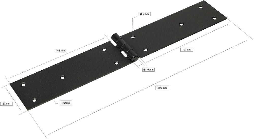 - TECHNISCHE DATEN - Scharnier 300x50 mm – Gesamtlänge: 300 mm, Flügellänge I: 143 mm, Flügellänge II: 143 mm, Breite: 50 mm, Durchmesser Montageöffnung: 5 mm, Achsendurchmesser: 10 mm, Stärke: 2 mm, Material: Stahl, Gewicht: 0,259 kg