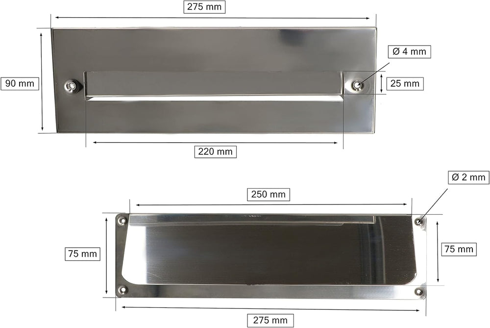 - TECHNISCHE DATEN - Briefeinwurf Edelstahl Teil I - Breite: 275 mm, Höhe: 90 mm, Abmessungen der Löcher: 220x25 mm, Durchmesser des Befestigungslochs: 4 mm Teil II - Gesamtbreite: 275 mm, Abmessungen des Deckels: 250x75 mm, Höhe: 75 mm, Durchmesser der
