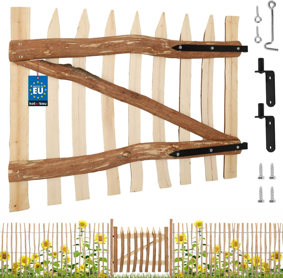 - ✔️ HOLZPFORTE AUS HOLZLATTEN FÜR DEN KOTARBAU HOLZZAUN. Eine Holzpforte, die in einem Holzzaun oder einem Lattenzaun installiert werden kann. Sie ist aus halben Haselholzlatten hergestellt und mit Querbalken und zwei Stahlscharnieren verstärkt.
