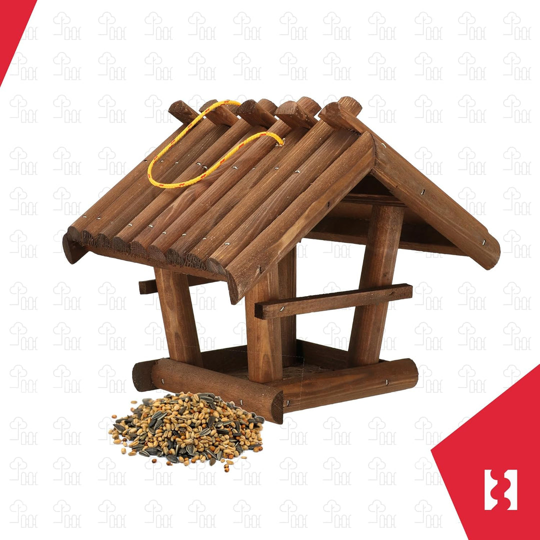 - TECHNISCHE DATEN -Dunkelbraun - Breite der Basis: 180 mm, Länge der Basis: 180 mm, Gesamthöhe: 260 mm, Länge der Überdachung: 290 mm, Material: Holz, Gewicht des Futterkasten: 1,428 kg, Gewicht des Futters: 0,5 kg . Die genauen Abmessungen finden Sie