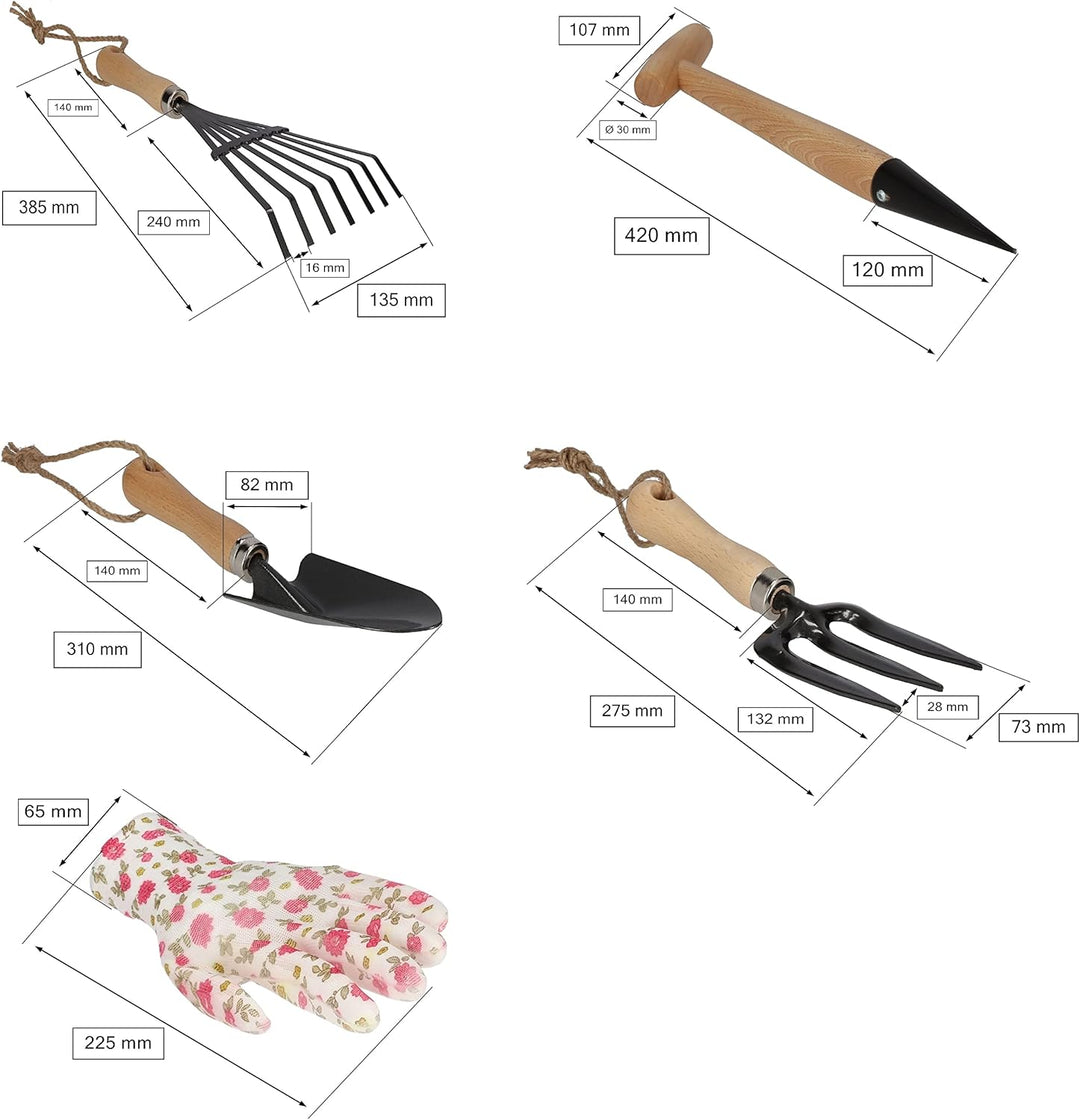 - ✔️ TECHNISCHE DATEN - KOTARBAU Kleinwerkzugsatz Pflanzlochstecher, Rechen, Gabel, Blumenkelle und Handschuhe - Gesamtabmessungen der Harke: 385mm, Schaft: 140mm, Zinkenabmessungen: 135x240mm, Gesamtlänge des Pflanzlochstechers: 420mm, Spitze: