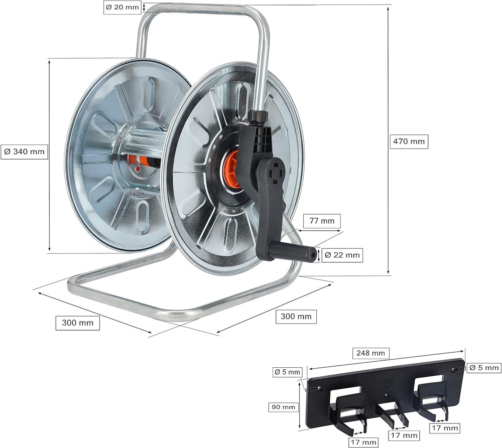 - ✅ TECHNISCHE DATEN - Tragbare Wandtrommel für Gartenschlauch - Trommeldurchmesser: 340mm, Sockelgrösse: 300x300mm, Höhe: 470mm, Grifflänge: 77mm, Aufsatzgrösse: 248x90mm, Hakenbreite: 17mm, Gewicht: 2.615kg