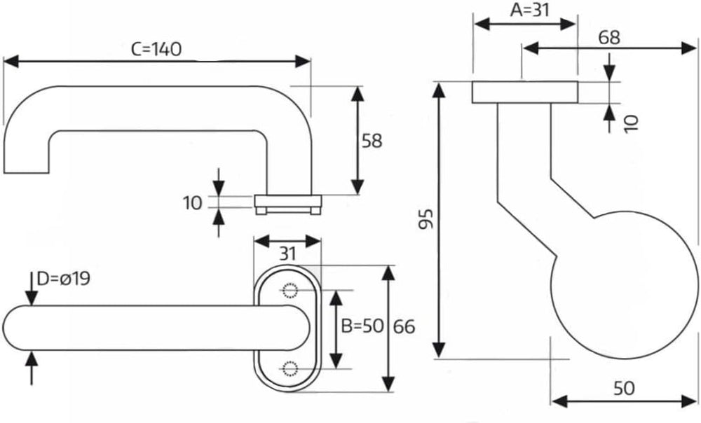 - TECHNISCHE DATEN - Türbeschlag Knopf – Türgriff Rechts - Breite: 140 mm, Tiefe: 58 mm, Griffdurchmesser: 19 mm, Breite Schildes: 31 mm, Höhe des Schildes: 66 mm, Abstand der Befestigungslöcher: 50 mm, Länge des Knopfes: 95 mm, Knopfbreite: 50 mm,