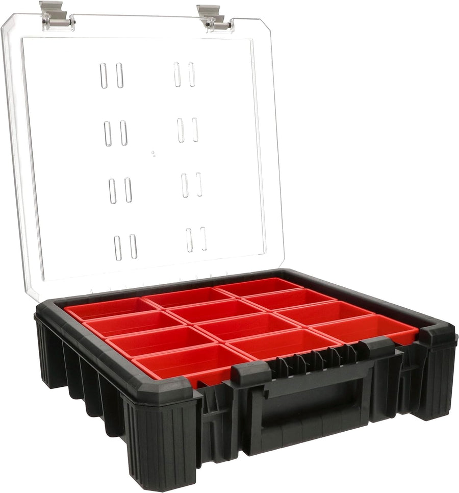 - TECHNISCHE DATEN - Organizer 39x40x11 cm - Höhe: 110 mm, Breite: 400 mm, Länge des Deckels: 390 mm, Abmessungen des einzelnen Behälters: 100x68x92 mm, Material: Kunststoff, Polycarbonat, Aluminium, Anzahl der Behälter: 12, Gewicht: 2,066 kg