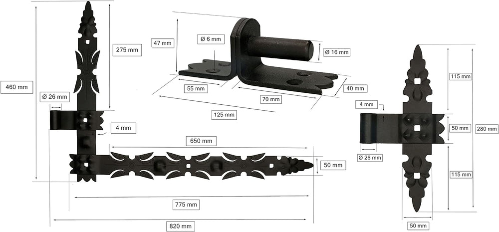 - TECHNISCHE DATEN Scharnier– Gesamtlänge: 820 mm, Länge: 775 mm, Höhe 460 mm, Breite: 50 mm, Länge des Zierelements: 650 mm, Stärke: 4 mm, Durchmesser des Befestigungsbohrung: 26 mm, Kloben - Abmessungen: 125x40 mm, Tiefe: 47 mm, Durchmesser des