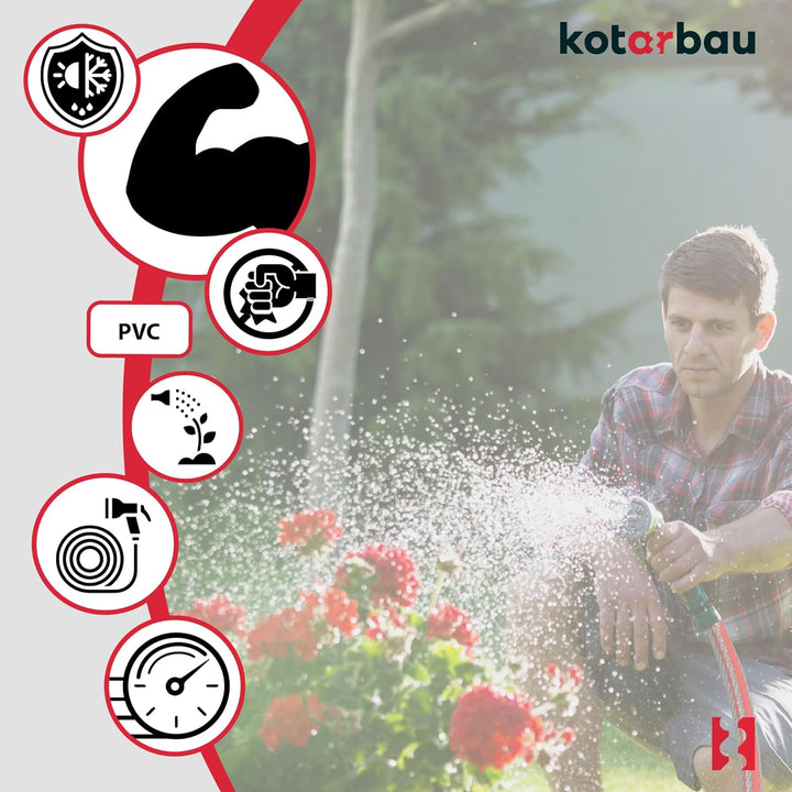 - EIGENSCHAFTEN – Der KOTARBAU Gartenschlauch besteht aus flexiblem PVC, das mit Polyestergarn verstärkt ist. Er ist langlebig und beständig gegen Witterungseinflüsse - niedrige und hohe Temperaturen sowie UV-Strahlung und Algenwachstum.