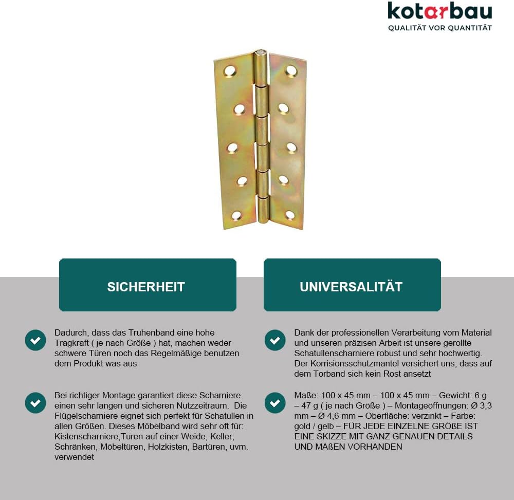 - SICHERHEIT- Dadurch, dass das Truhenband eine hohe Tragkraft ( je nach Grösse ) hat, machen weder schwere Türen noch das Regelmässige benutzen dem Produkt was aus. Bei richtiger Montage garantiert diese Scharniere einen sehr langen und sicheren