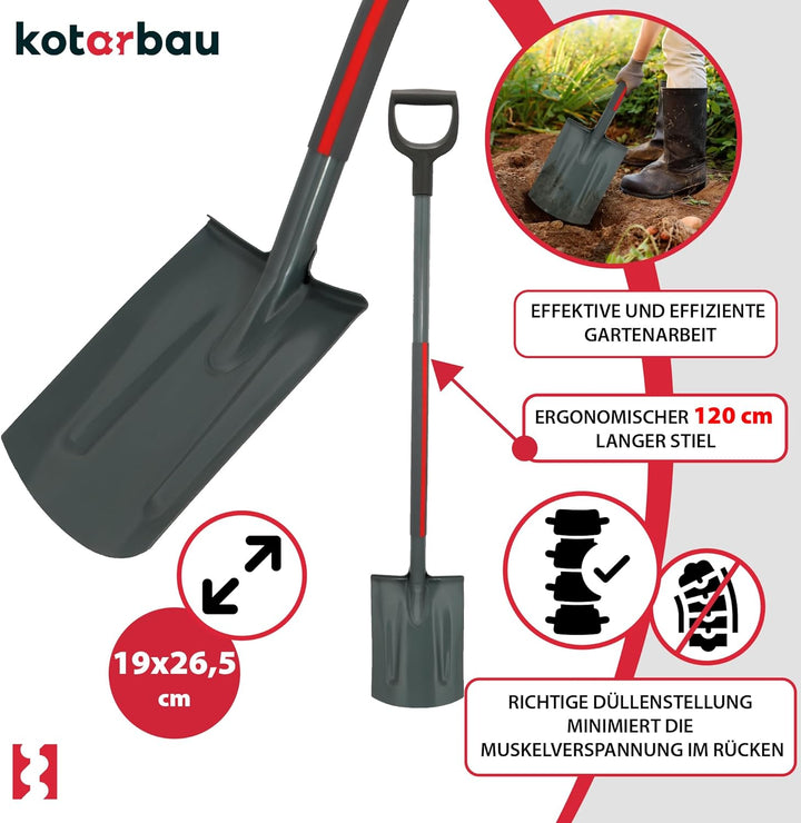 - IHR KOMFORT - Der KOTARBAU Gärtnerspaten hat einen ergonomisch geformten Stiel aus Metall. Der Neigungswinkel des Stiels minimiert die Belastung der Rückenmuskulatur und garantiert eine bequeme Körperhaltung bei der Arbeit.