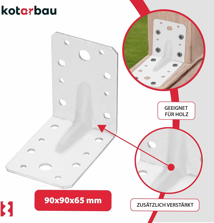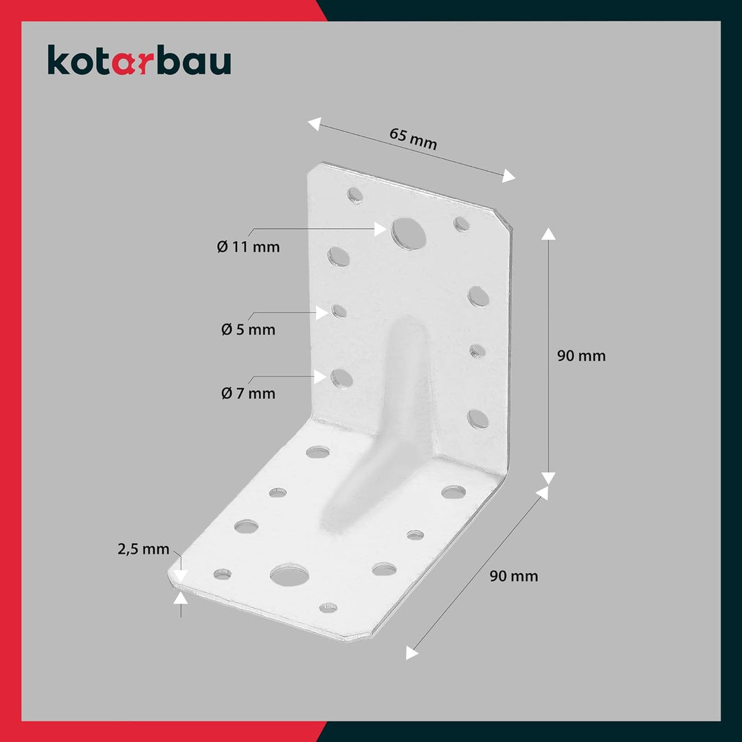 - TECHNISCHE DATEN: Set - 50 Stk. - Länge der Schenkel: 90 x 90 mm – Breite des Produkts: 65 mm – Stärke des Materials: 2,5 mm – Gewicht des Produkts: 14550g - mit Rippenverstärkung - 2 x Löcher: 11 mm – 20 x Löcher: 5 mm – Oberfläche: