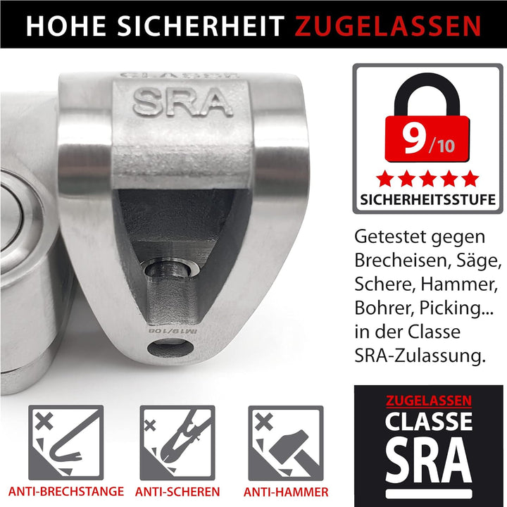 - SRA GENEHMIGT getestet gegen Säge, Scherung, Hammer, Hebel usw. in unabhängigen Labors, SRA-Zertifizierung.