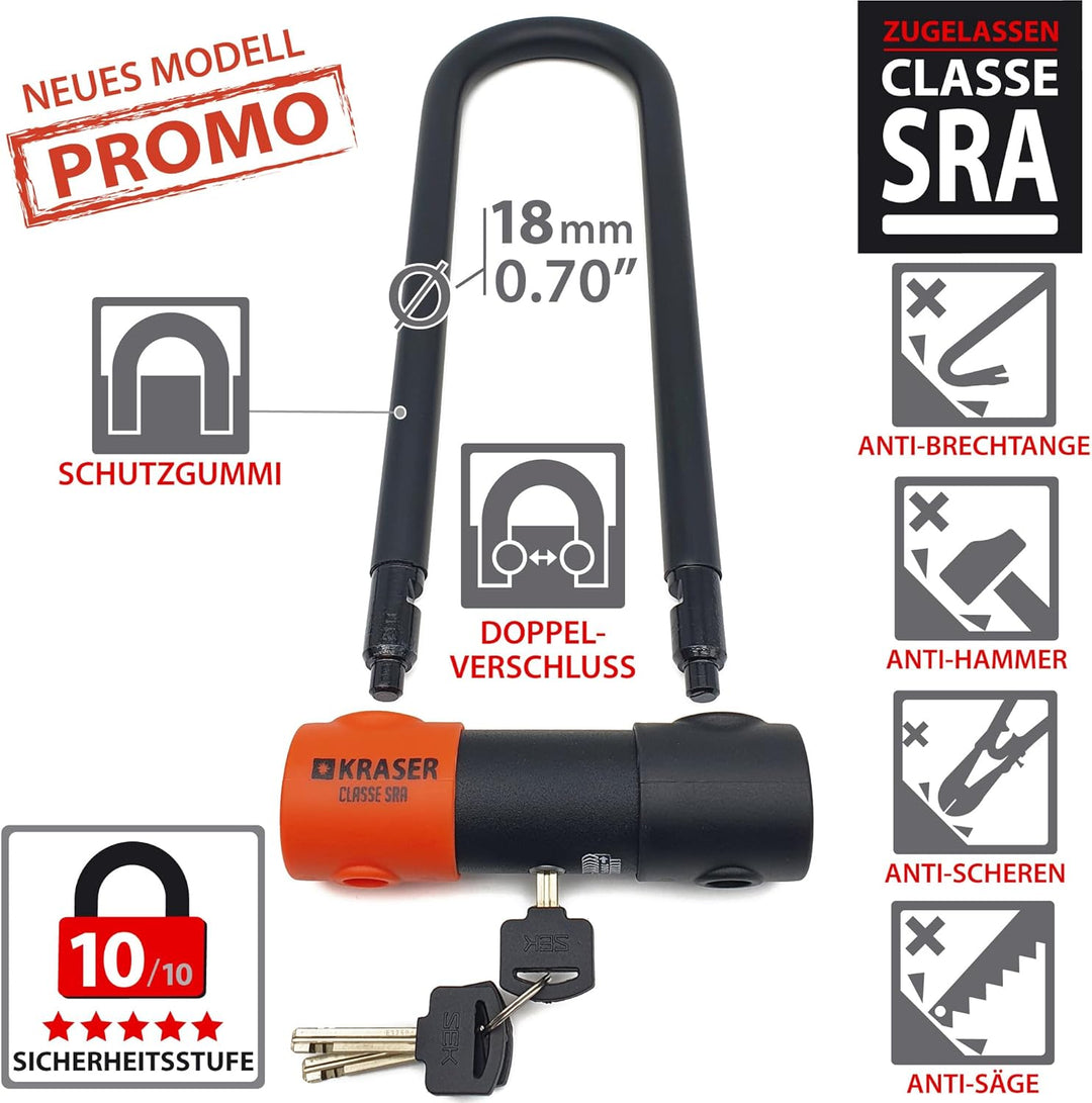 - HOMOLOGIERT Anti-Diebstahl-Schloss für das Motorrad, Roller oder Fahrrad, es wurde gegen Säge, Schere, Hammer, Hebel usw. In unabhängigen Labors garantiert die SRA-Zertifizierung Zuverlässigkeit und Wirksamkeit als Diebstahlsicherung.