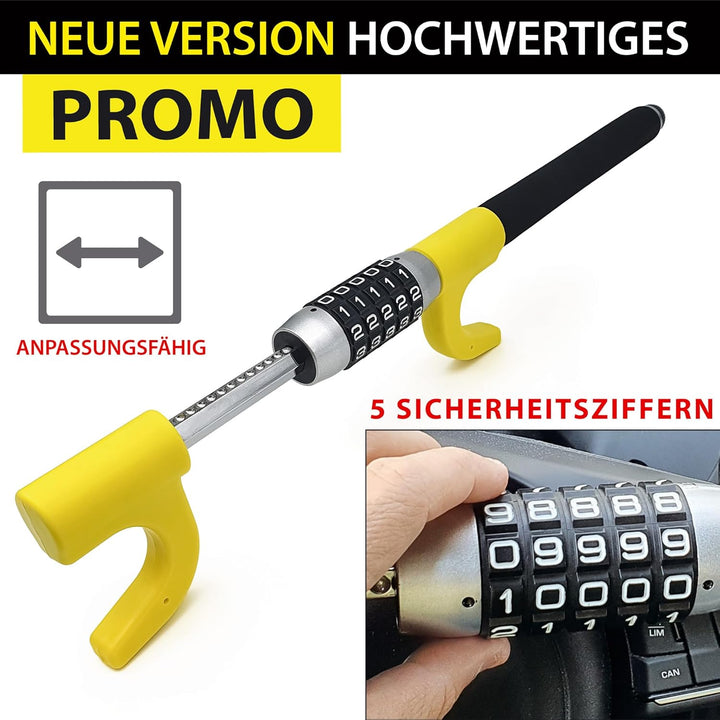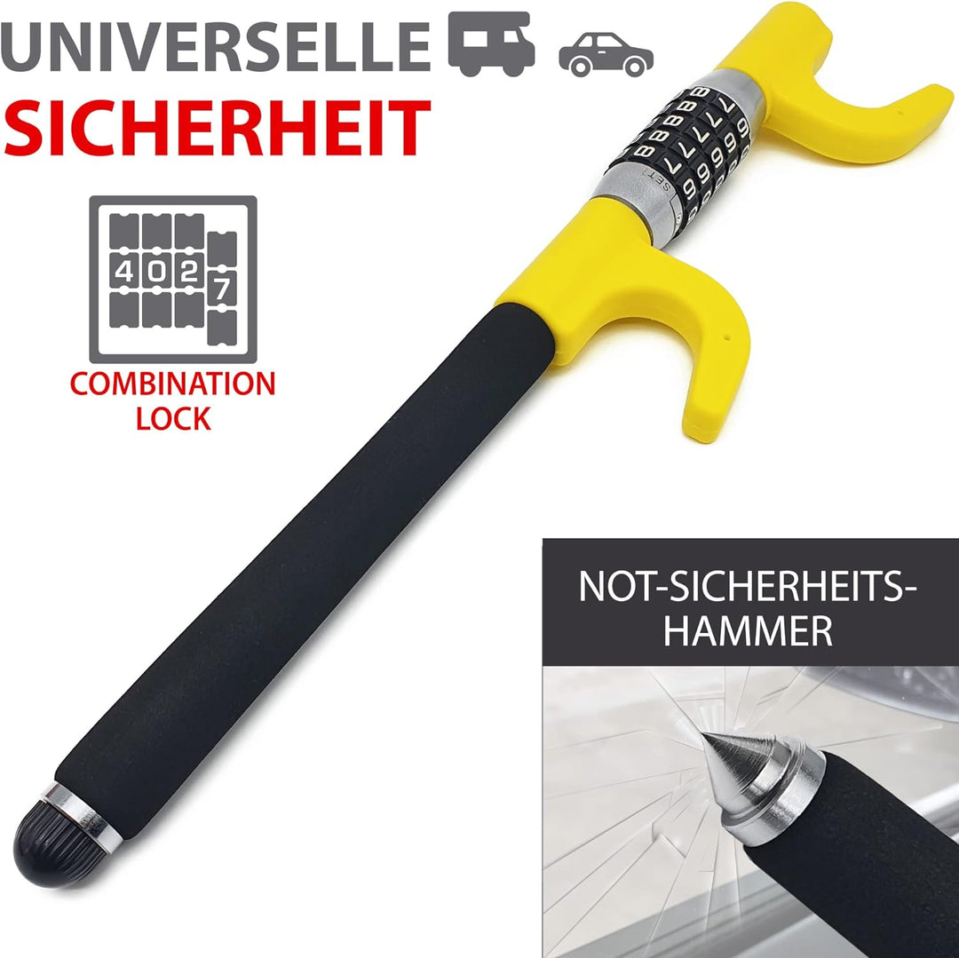 - LENKRADKRALLE: Die Lenkradsperre mit Zahlenschloss ist hochwertig und sichtbar, um Diebe abzuschrecken. Lenkradschloss mit integriertem Nothammer und Sicherheitsverschluss.