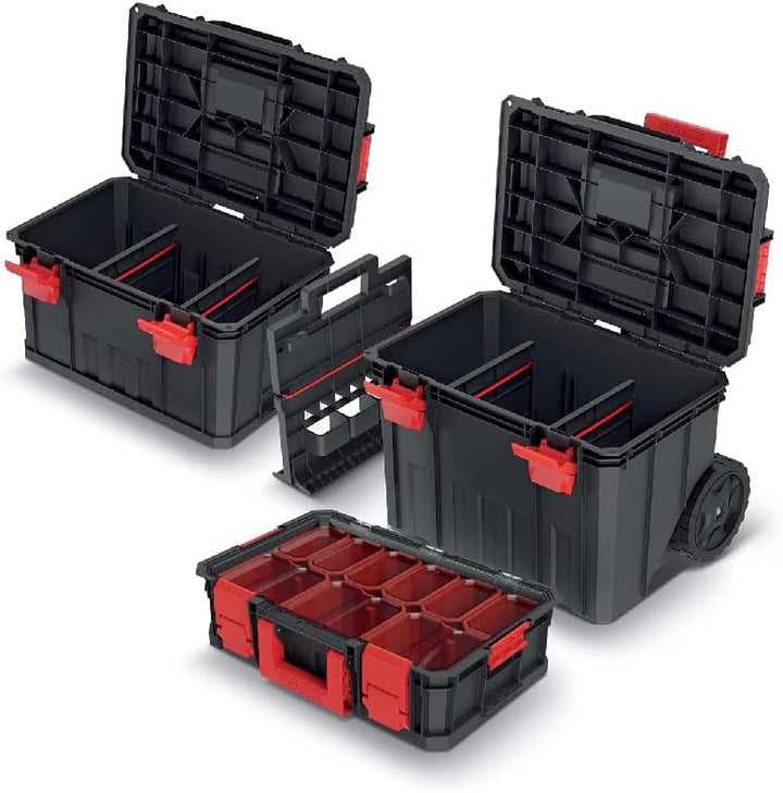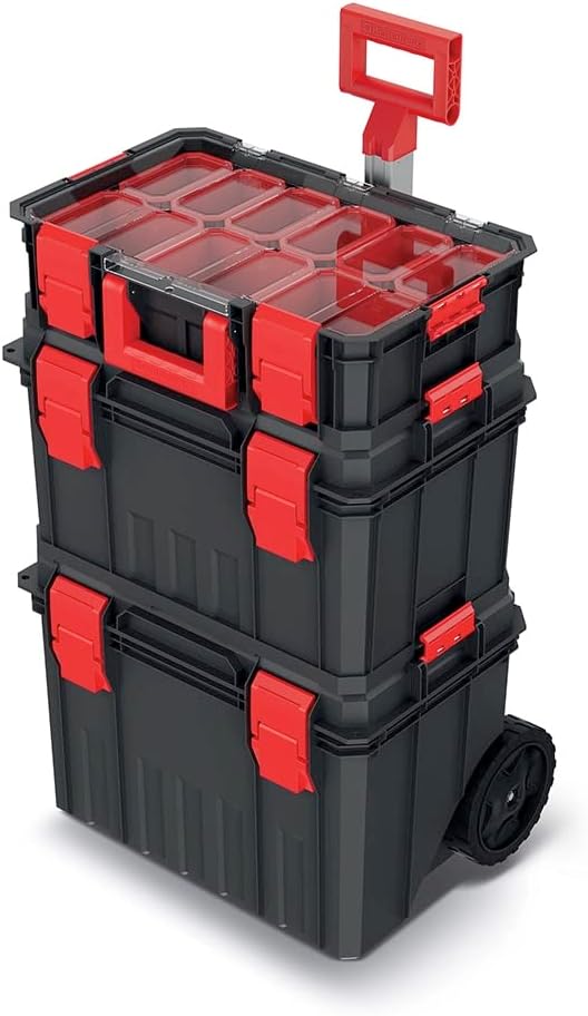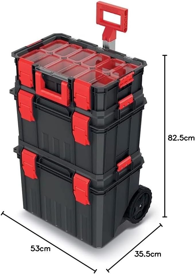 - Ausstattung: 1 x Fahrbares Cart, ausgestattet mit einer heuausziehbaren Teleskop Stange und einem komfortablen Tragegriff und drei herausnehmbaren Fächern im inneren | 1 x Werkzeugkiste, ausgestattet mit einem komfortablen Tragegriff und zwei
