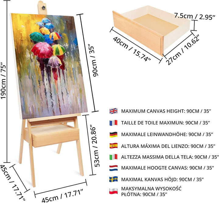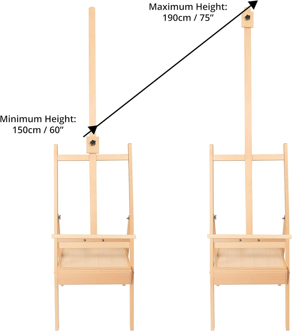 - GROSSE ATELIERSTAFFELEI: Diese grosse Holz Staffelei in H-Form ist verstellbar und komplett aufgebaut misst sie 190 cm. Die Staffelei besteht aus solidem geöltem Buchen Holz und wiegt 6 kg. Der Malständer für Leinwände kann eine Reihe verschiedener
