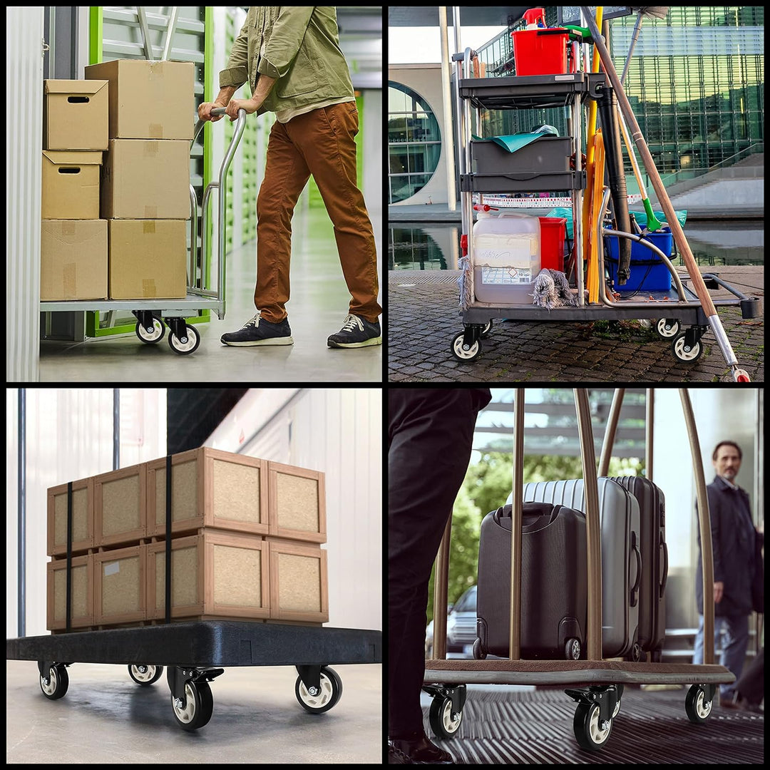- STABIL & LANGLEBIG: Die Lenkrollen Schwerlast Rollen haben eine Ladekapazität von 80 kg pro Rad und halten insgesamt 320 kg. Da das Möbel Transportrollen Set aus Gummi besteht, ist es strapazierfähig, verschleiss- und rostbeständig, dämpft