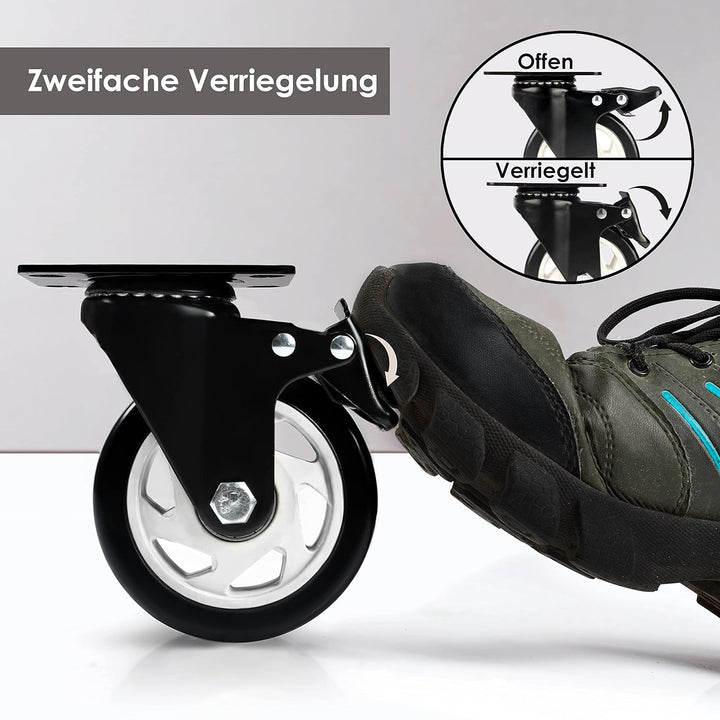 - DOPPELTER SPERRMECHANISMUS: Mit dem Bremspedal hindern Sie die rutschfesten Schwerlastrollen am Drehen. So können Sie Ihre Möbel/Werkbank leicht positionieren und stoppen oder beim Putzen ohne Aufwand verschieben. Der doppelte Sperrmechanismus