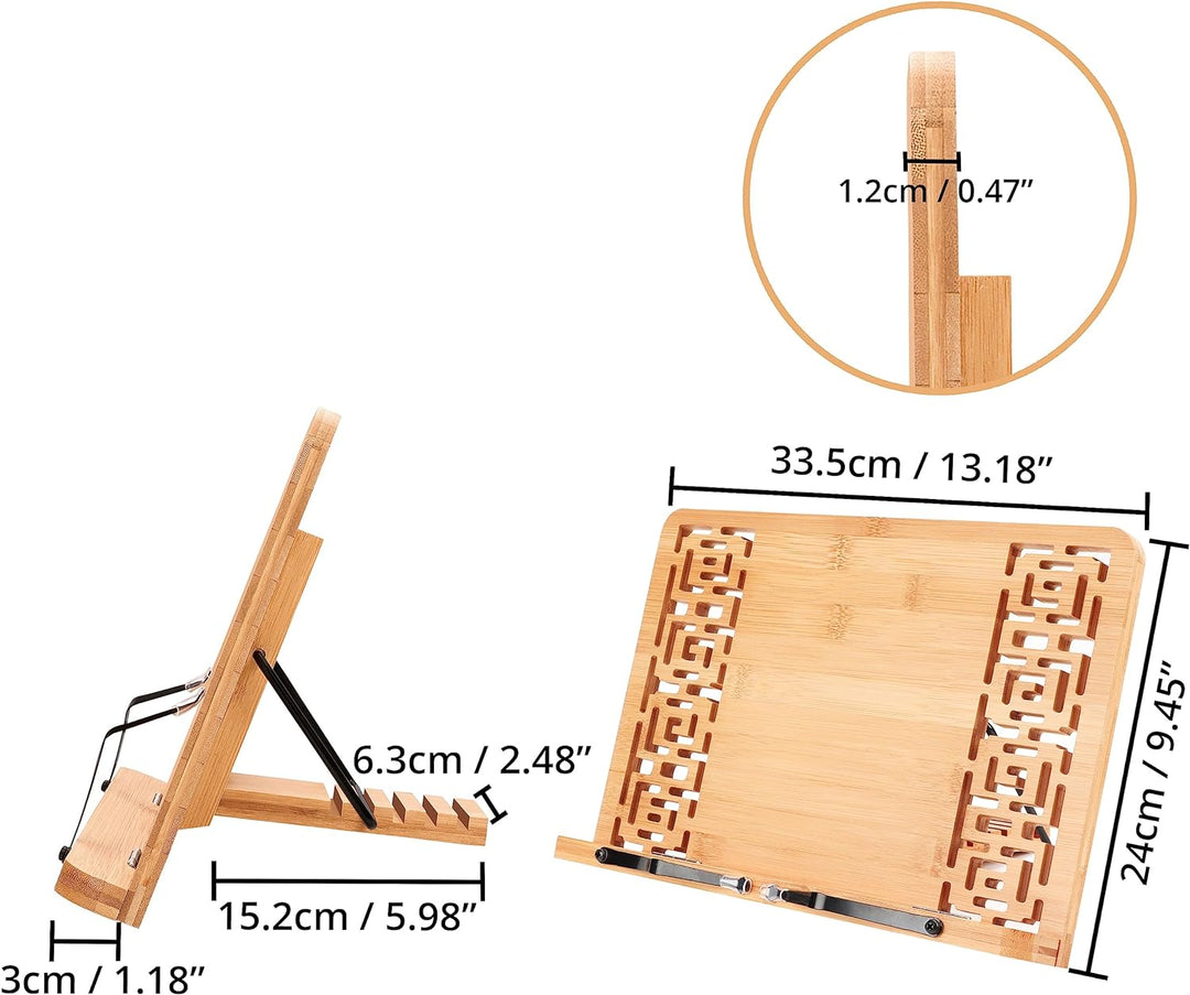 - BAMBUS BUCHAUFSTELLER: Unser Bambus-Buchstütze Holz ist 33,5 cm breit und 24 cm hoch. Der Leseständer aus Holz hat eine Dicke von 1,2 cm und das Regal, um Ihr Buch zu halten, ist 3 cm tief. Der Buchständer auf der Rückseite ist 15,2 cm lang und 6,3