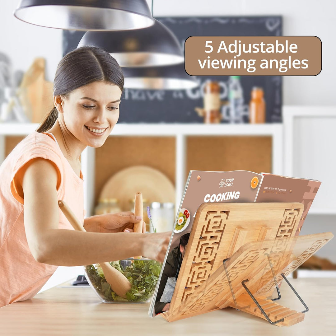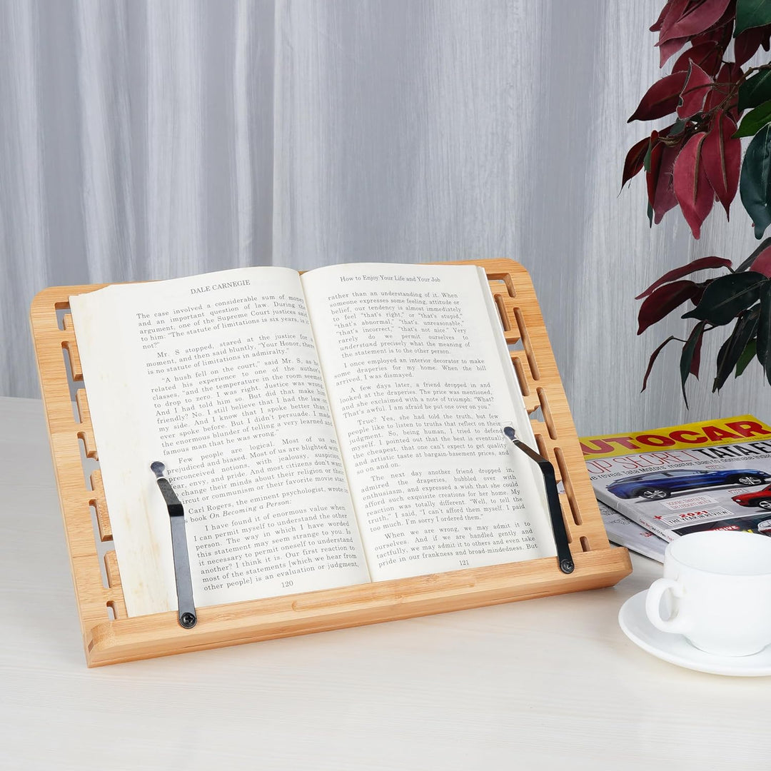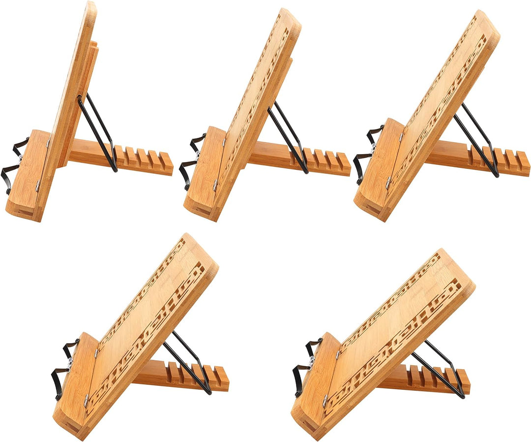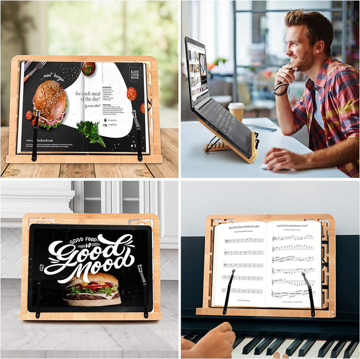 - EINSTELLBARER BUCHHALTER LESESTĀNDER: Der Kochbuchhalter hat auf der Rückseite einen Ständer, der in die Basis der Buchhalterung eingesteckt wird. Es gibt 5 Schlitze, die den Ständer in 5 verschiedene Positionen neigen. Positionieren Sie den