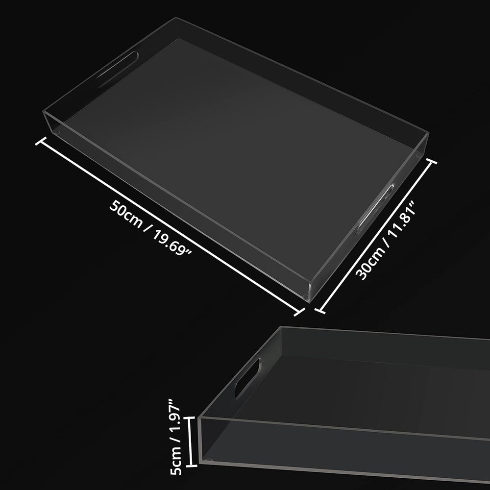 - SERVIERTABLETT: Unser rechteckiges Tablett Serviertablett besteht aus stabilem langlebigem Acryl Kunststoff, der leicht zu reinigen ist. Dieses Tablett gross ist transparent und besitzt stabile dicke Wände, um Verschüttetes aufzufangen. Sie besitzen ausserdem zwei Henkel zum Tragen. Alle Seiten, Ecken, Griffe und Unterseite sind komplett glatt und ohne scharfe Kanten, die Hände oder Oberflächen beschädigen könnten. Das Tablett mit Tragegriff ist 50 cm lang, 30 cm breit und 5 cm hoch.