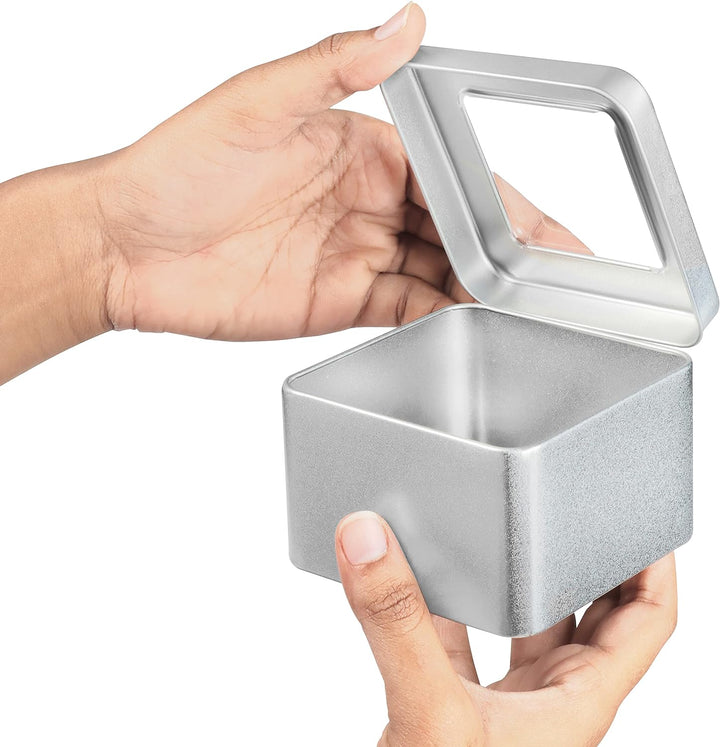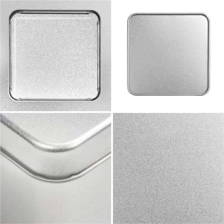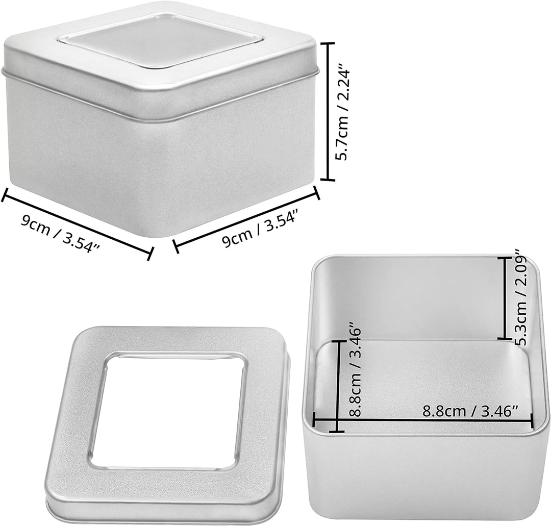 - ZINN-AUFBEWAHRUNGSBOX: In dieser Packung sind 10 silberne Aufbewahrungsboxen enthalten. Die Metalldosen mit Deckel sind quadratisch, glatt und haben abgerundete Kanten. Diese Box mit Klappdeckel ohne Scharniere bestehen aus Eisen, das langlebig & robust ist. Jede Aufbewahrungsdose enthält einen abnehmbaren Deckel. In der Mitte des Deckels befindet sich eine grosse durchsichtige transparente Kunststoffplatte. Jede Dose misst L9x B9x H5,7cm. Das Innenmass der Metall Boxen beträgt L8,8x B8,8x H5,3cm.