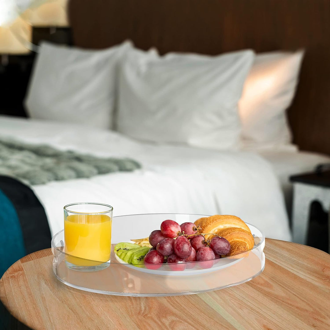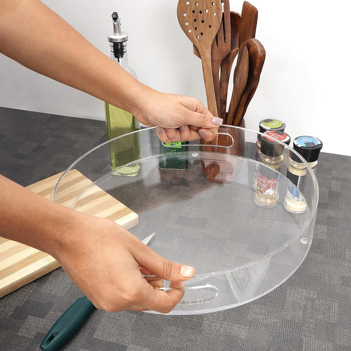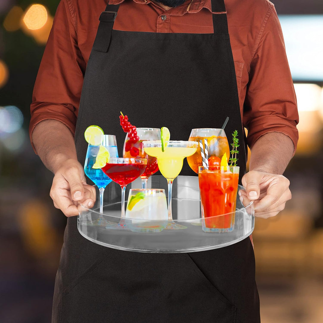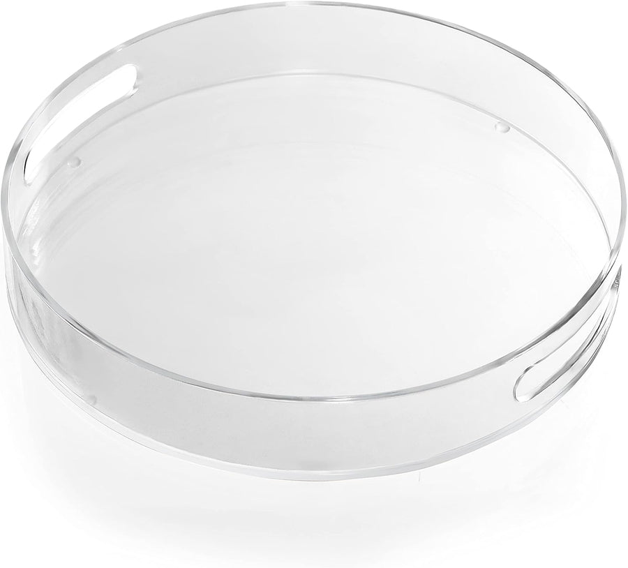 - TABLETT SERVIERTABLETT: Unsere runden Serviertabletts sind aus starkem, haltbarem und leicht zu reinigendem Acrylkunststoff. Sie sind transparent und verfügen über dicke Wände, um verschüttete Flüssigkeiten aufzufangen. Durch die zwei Griffe ist das