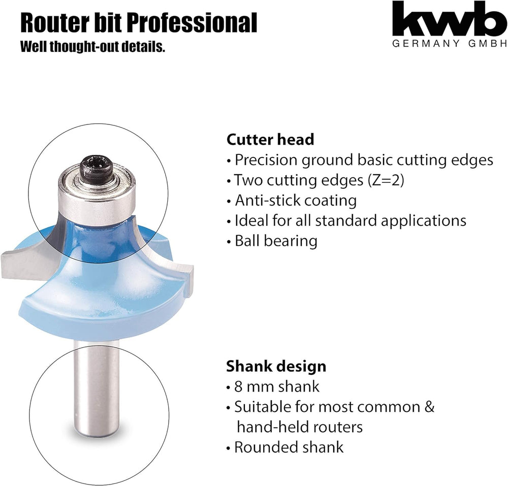 - HARTMETALLBESTÜCKT: Der 2-schneidige kwb Abrundfräser für die Oberfräse verfügt über eine hartmetallbestückte, präzisionsgeschliffene Schneide, die eine sehr hohe Standzeit in harten sowie weichen Hölzern besitzt.