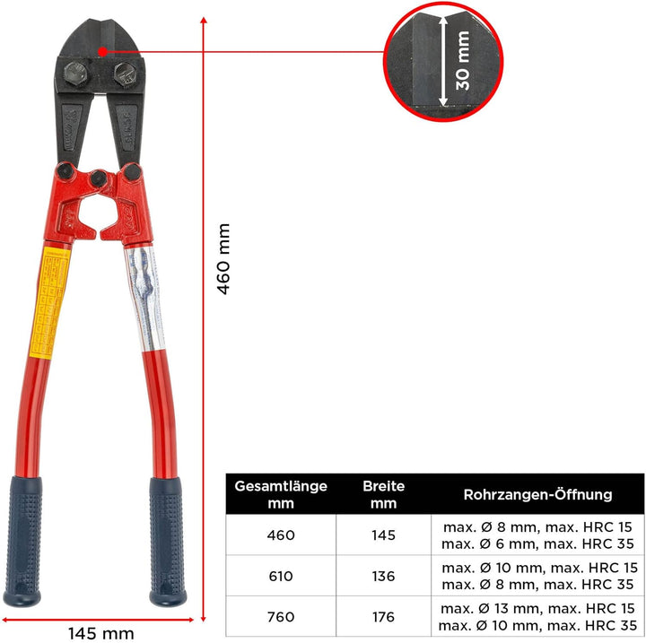 • Ø 8 MM ZANGENÖFFNUNG: Mit dem Bolzenschneider können Drähte und Stahlstangen bis Ø 8 mm (max. HRC 15) und Ø 6 mm (max. HRC 35) geschnitten werden.
