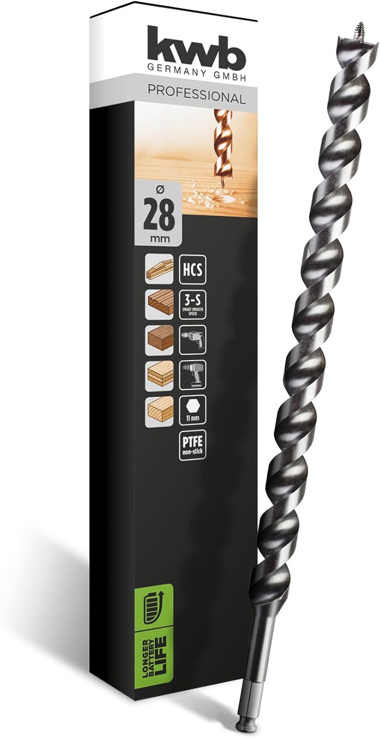 - SPEZIELLER SPITZENANSCHLIFF: Durch den speziellen Spitzenanschliff und die breite Spirale erzeugt der Schlangenbohrer von kwb kleine Holzspäne, die schneller abtransportiert werden können.