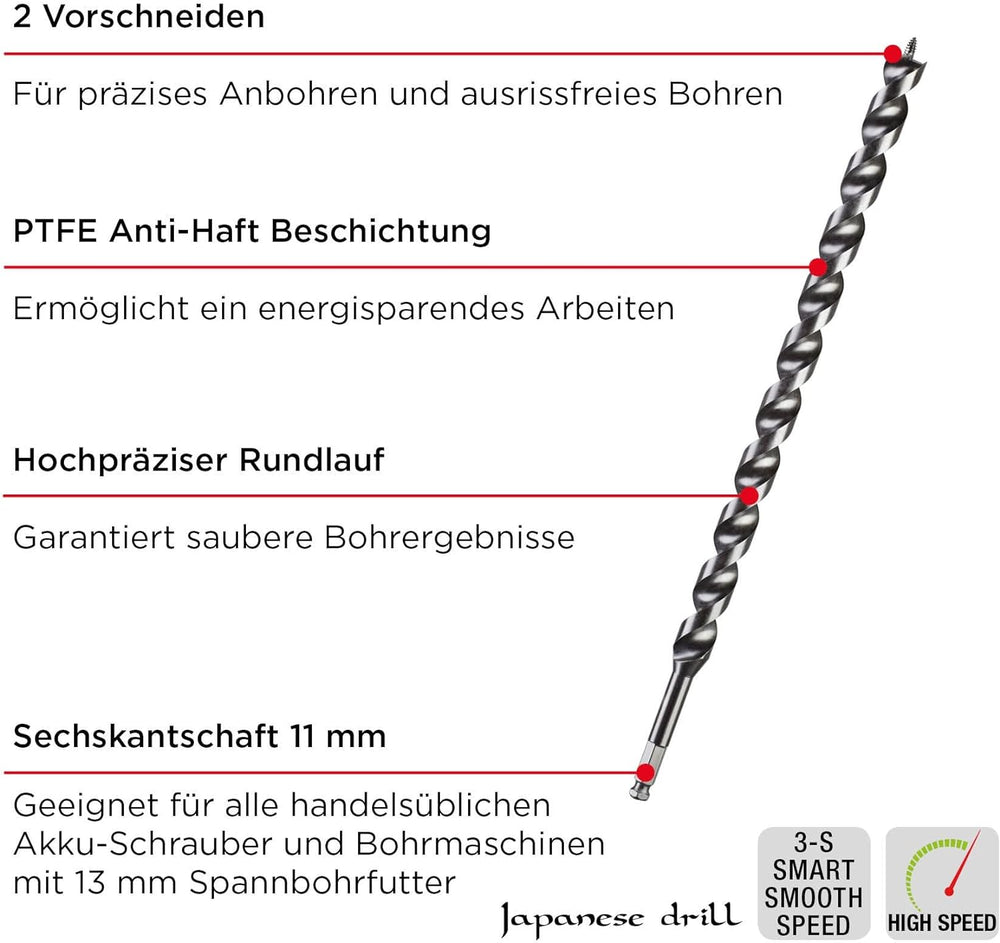 - LANGE LEBENSDAUER: Der Japan Schlangenbohrer besteht aus robustem, hochfestem Kohlenstoffstahl, der in härtesten Hölzern verwendet werden kann, ohne sich festzusetzen.