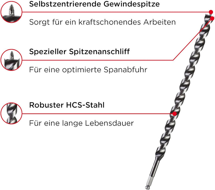 - SELBSTZENTRIERENDE GEWINDESPITZE: Der hochpräzise verarbeitete Bohrkopf zieht den Holzbohrer Schlangenbohrer nahezu von selbst in das Bohrloch und ist für schnelle Bohrungen mit geringem Kraftaufwand ausgelegt, da kaum zusätzlicher Druck aufgebaut