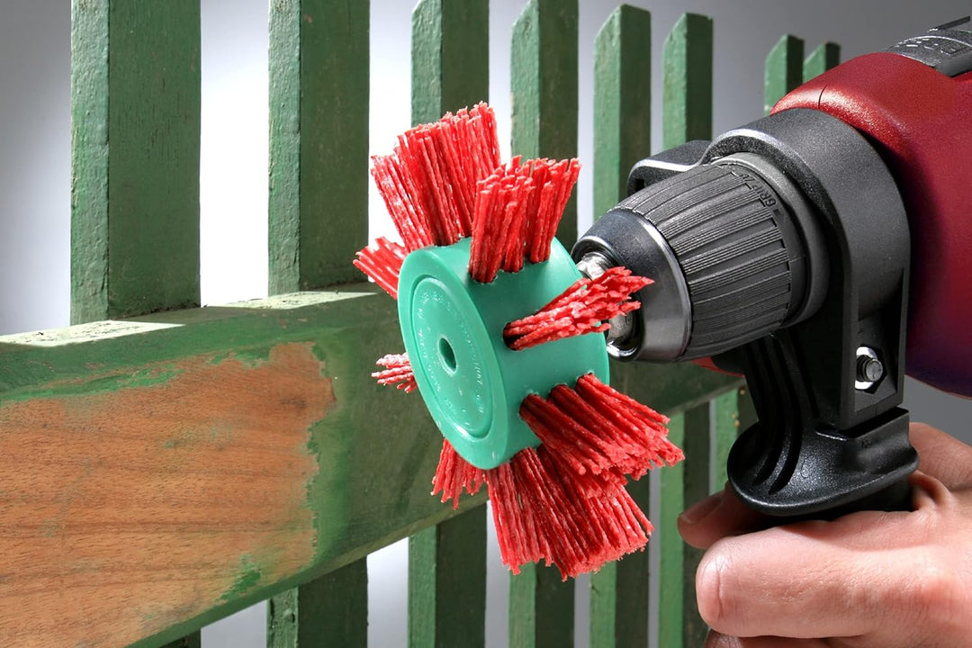 - Mit der Bohrmaschinen-Bürste lassen sich Weichere Oberflächen wie z, B, Holz strukturieren und härtere Materialien wie Stahl oder Buntmetalle mattieren