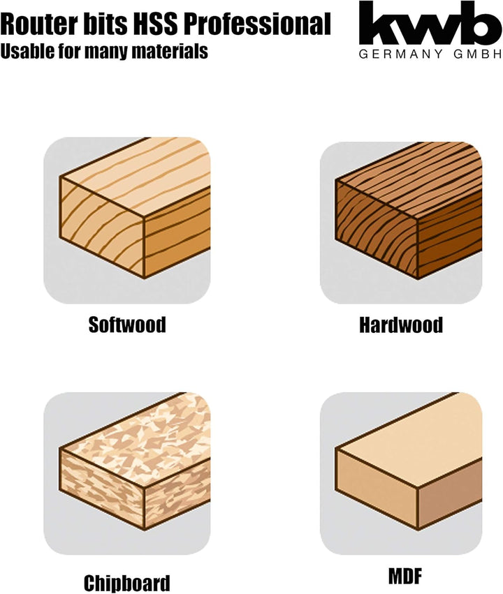 - HSS STAHL: Der Holz-Nutfräser aus HSS Stahl ist im Vergleich zu herkömmlichen Fräsern besonders langlebig, da dieses Material für seine Härte, Hitzebeständigkeit und Verschleissfestigkeit bekannt ist.