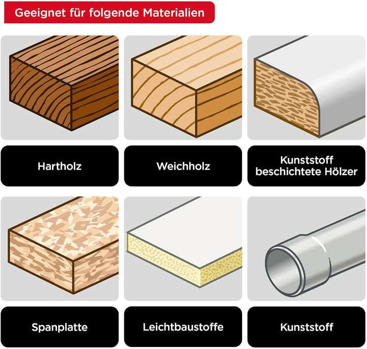 • MIT ZENTRIERBOHRER: Mithilfe des Zentrierbohrers für die Bohrkrone ist ein leichter Start ohne Abrutschen und ein genaues Ansetzen in Holz, kunststoffbeschichtetes Holz, Spanplatten, Kunststoff und Leichtbauplatten möglich.