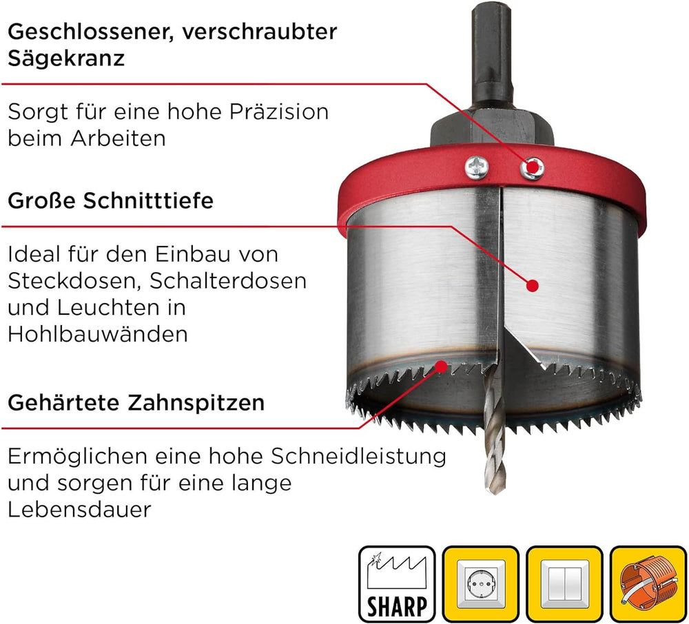 • 40 MM SCHNITTTIEFE: Durch die Schnitttiefe der Bohrkrone von 40 mm ist die Installation von Einbaustrahlern und der Einbau von Hohlraumdosen für Steck- und Verteilerdosenmontagen sowie Rohrdurchlässe möglich.