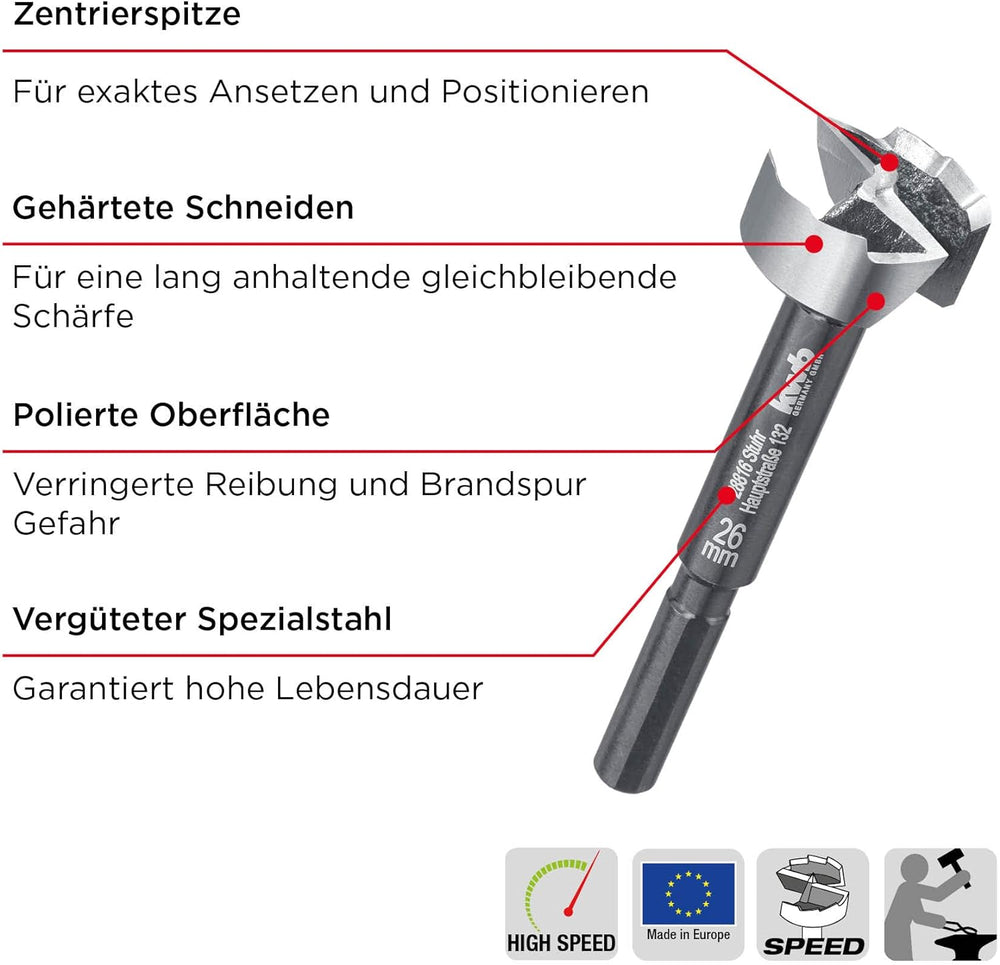 - VERGÜTETER SPEZIALSTAHL: Hergestellt aus vergütetem Spezialstahl bietet der SPEED Forstnerbohrer eine 3-fache Standzeit und ermöglicht ein deutlich schnelleres Vorankommen im Material im Vergleich zu herkömmlichen Forstnerbohrern.