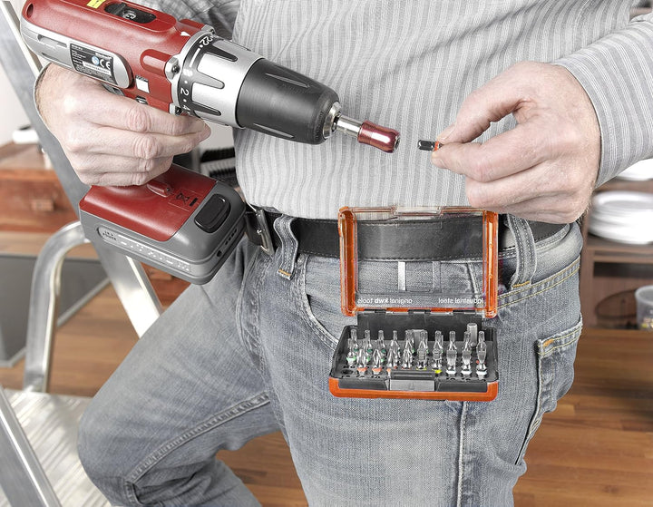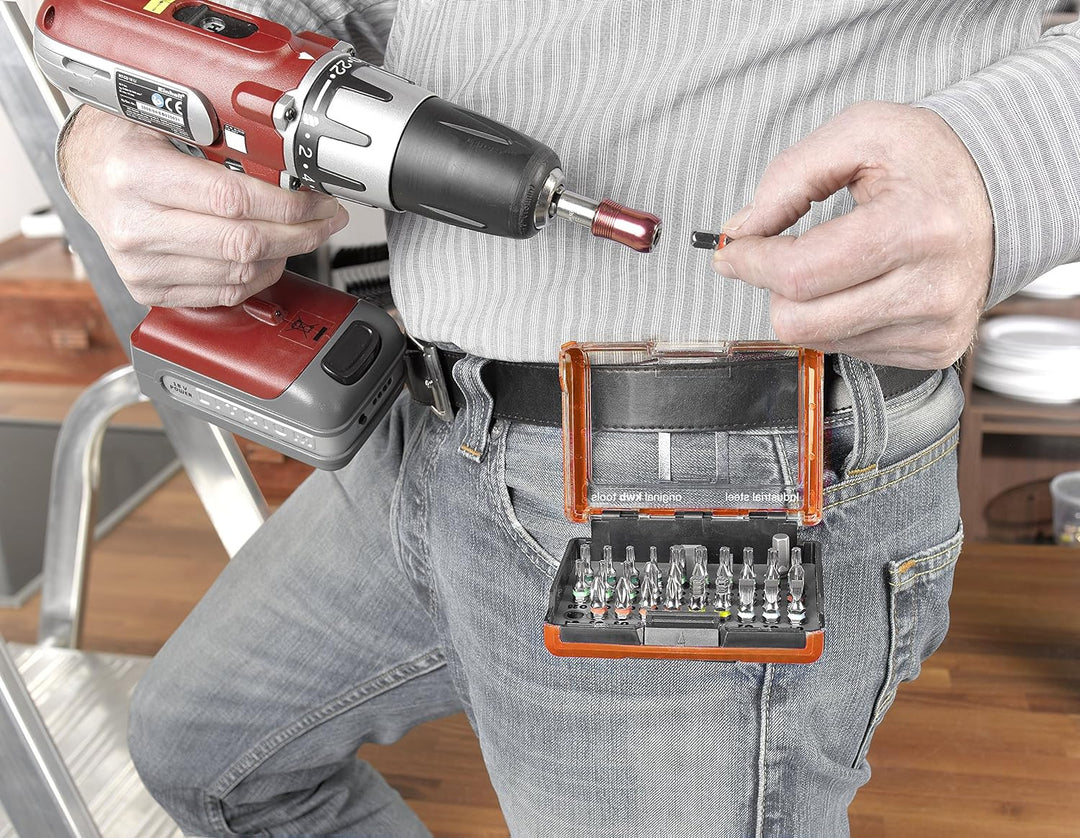 - Umfangreiches Bit-Set, bestehend aus 25 mm und 50 mm Bits mit Mega-Grip Rips, Bit-Halter und Adapter in robuster Kunstoff-Box mit praktischem Gürtel-Clip.