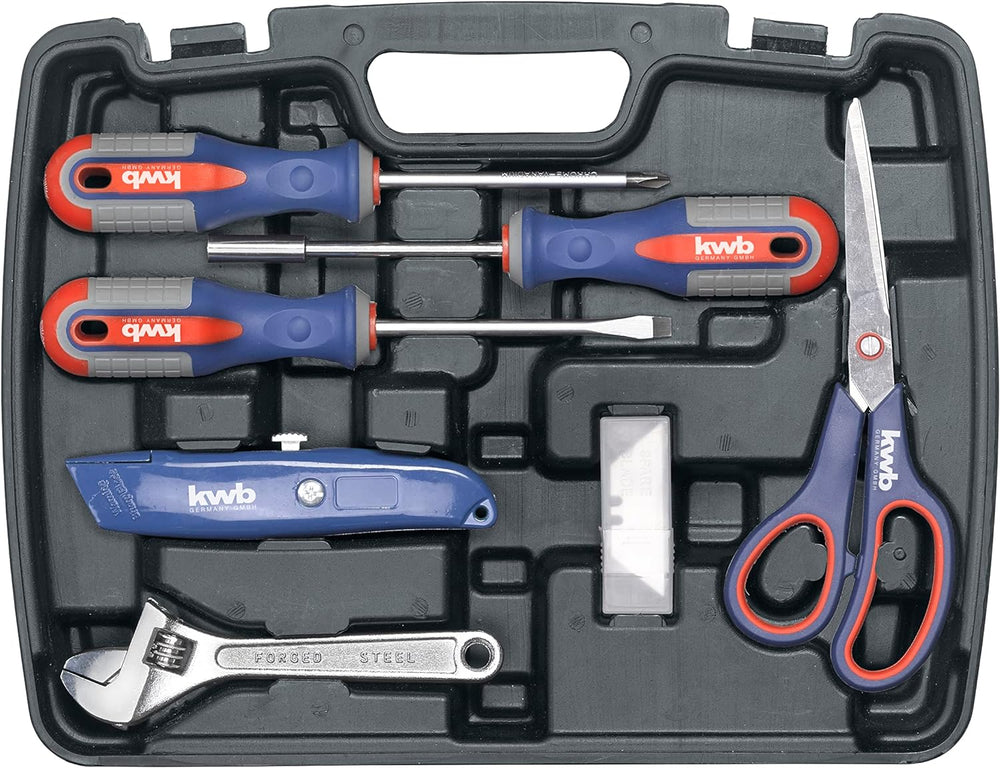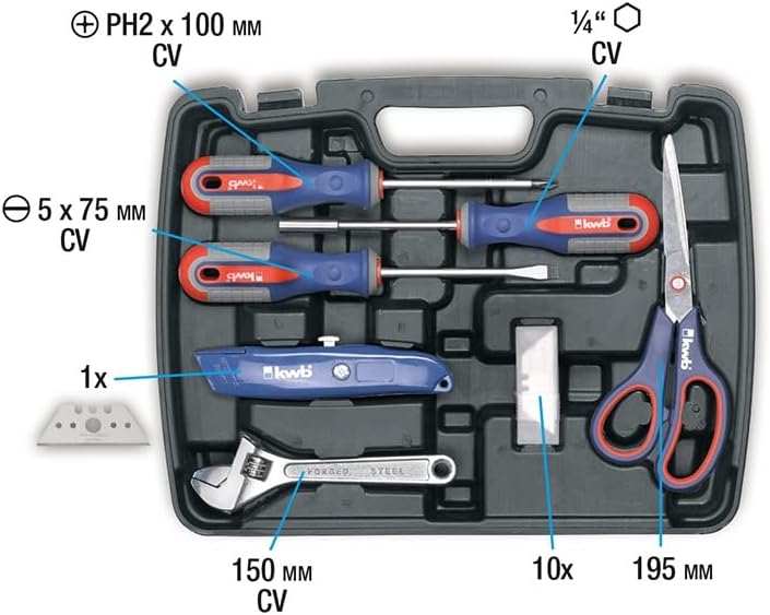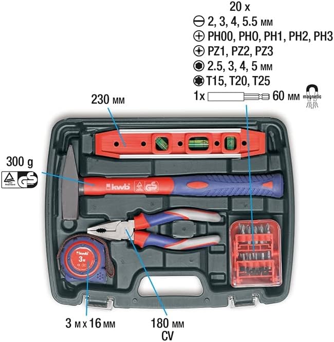 - Bestückt mit Werkzeugset aus Chrom Vanadium Stahl mit 10 Jahren Garantie. Das Komplett-Set bietet neben Hammer und Schraubenzieher auch eine Kombizange, eine Wasserwaage sowie diverse weitere Werkzeuge.