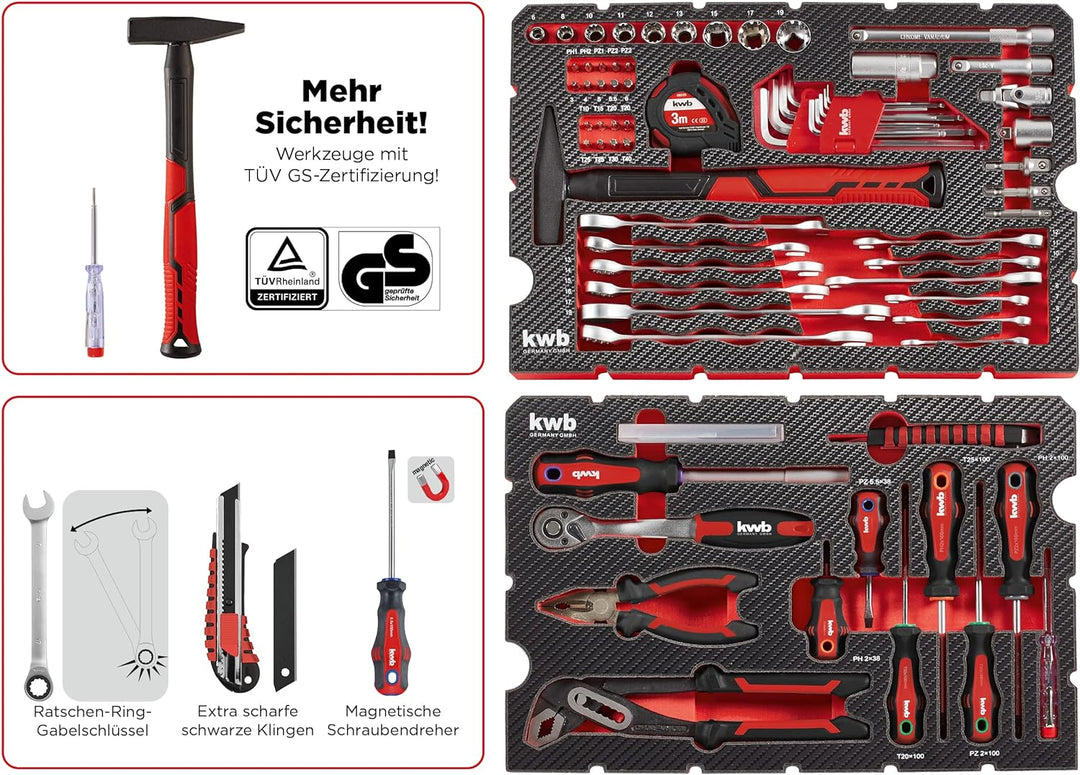- 3 RING-RATSCHENSCHLÜSSEL: Unter den diversen Maul-Ringschlüsseln in den Grössen 6, 7, 8, 10, 11, 12, 13, 14, 15, 16, 17 und 19 befinden sich auch 3 Ring-Ratschen-Schlüssel bei den üblichsten Abmessungen 10, 13 und 17 mm im Werkzeug-Koffer enthalten.
