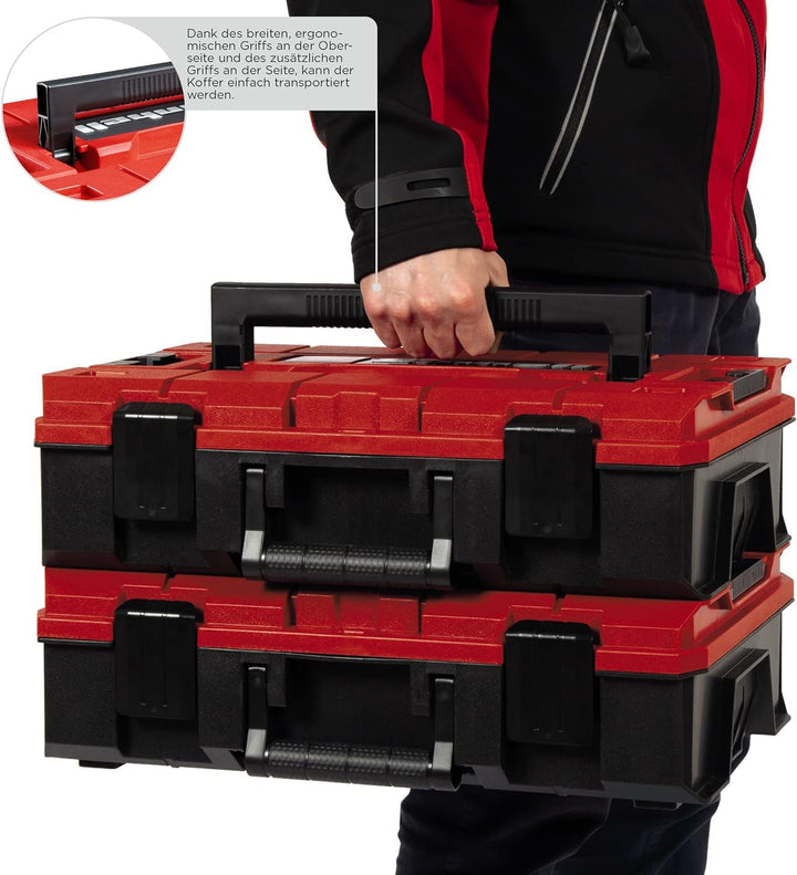 - SCHRAUBENDREHER UND ZANGEN: Abgerundet wird der Werkzeugkoffer, der nebenbei erwähnt mit dem Einhell E-Case System kompatibel ist, durch eine Kombi-Zange, Wasserpumpenzange, einen Schraubendreher mit 1/4'' Bitaufnahme und 6 verschiedenen