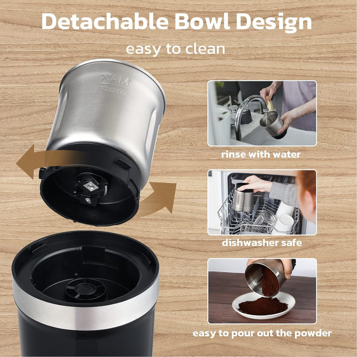 - ☕Freundlich zu reinigen - Mit der abnehmbaren Mahlschüssel können Sie sie direkt unter dem Wasserhahn reinigen oder in die Geschirrspüler stellen. Mit der elektrischen Kaffeebohnenmühle können Sie sich von Reinigungsproblemen befreien und Ihr
