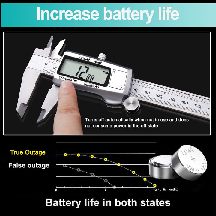 - 【Längere Lebensdauer】Der 150-mm-digitale Schieblehre nimmt ein vollständig ausgeführtes Design an. Es wird vollständig ausgeschaltet, wenn die Taste "OFF" gedrückt wird, was keine Batteriestrom verbraucht und eine längere Lebensdauer bietet als