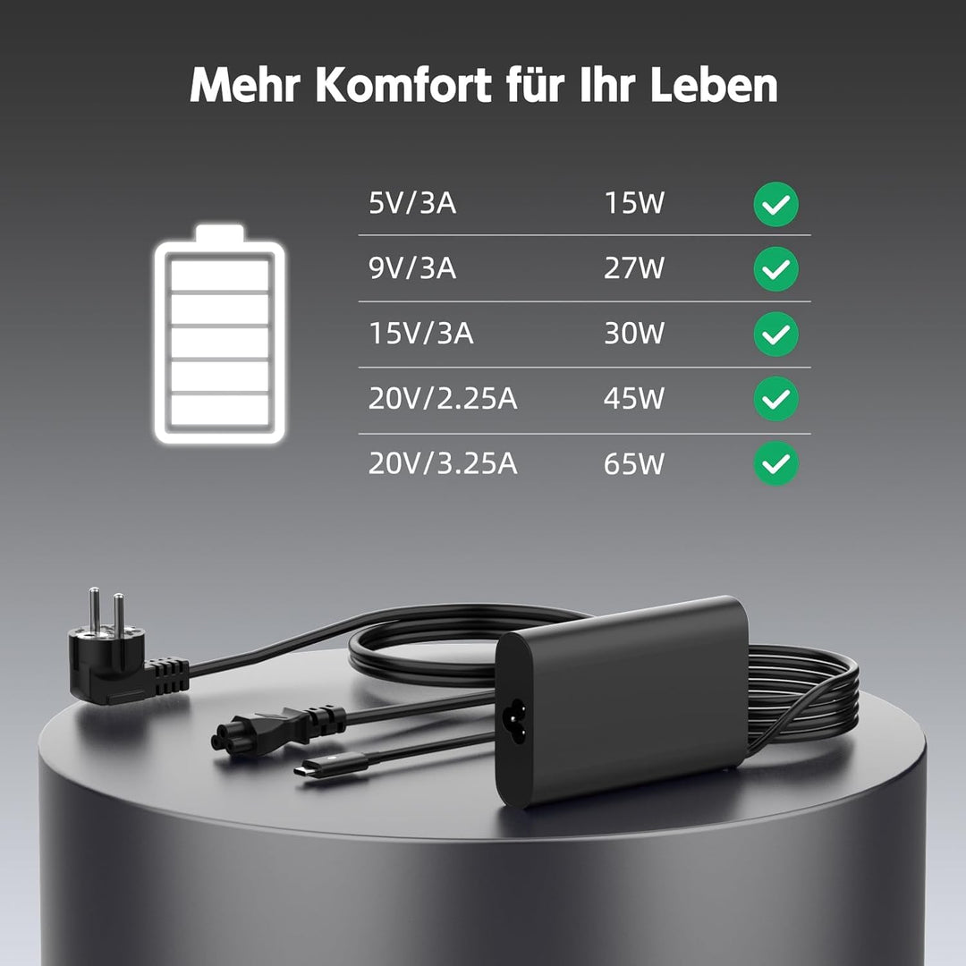 - ✅【Netzteil für Dell USB-C 65 Watt】Eingang: 100-240V 50-60Hz; Ausgang: 5V/3A,9V/3A,15V/3A,20V/2.25A,20V/3.25A 65W, Kompatibel mit 20V/2.25A 45W; Anschlussgrösse: USB C / Type C